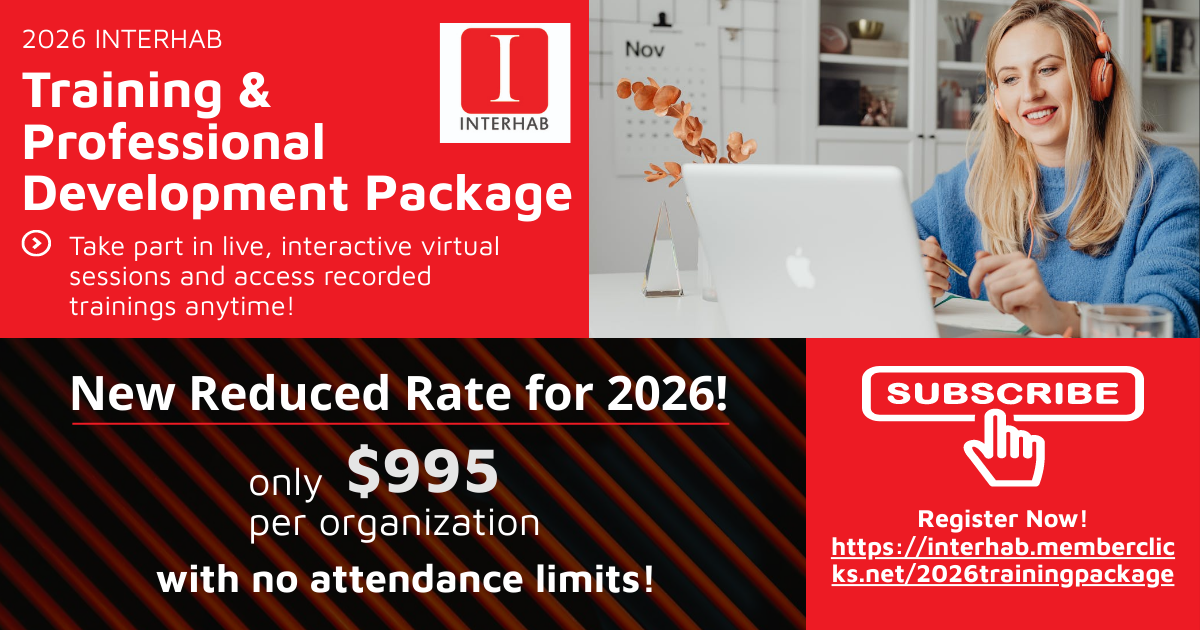The 2026 InterHab Virtual Training Package delivers high-quality, accessible professional development through live virtual training sessions each month. Each live session is recorded and made available to all registered subscriber organizations, allowing participants to learn in real time or access the content on demand at their convenience.